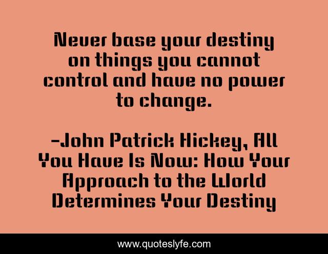 This page presents the quote "Never base your destiny on things you cannot control and have no power to change.". Author of this quote is John Patrick Hickey, All You Have Is Now: How Your Approach to the World Determines Your Destiny. This quote is about success, personal-growth, action, achievement, personal-development, goal-setting, goals,.