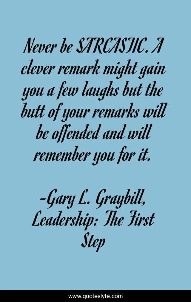 This page presents the quote "Never be SARCASTIC. A clever remark might gain you a few laughs but the butt of your remarks will be offended and will remember you for it.". Author of this quote is Gary L. Graybill, Leadership: The First Step. This quote is about management-and-leadership, leadership-development,.