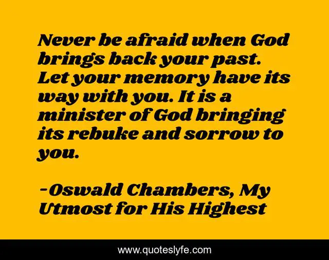 This page presents the quote "Never be afraid when God brings back your past. Let your memory have its way with you. It is a minister of God bringing its rebuke and sorrow to you.". Author of this quote is Oswald Chambers, My Utmost for His Highest. This quote is about guilt, regret, memory,.