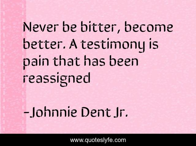 This page presents the quote "Never be bitter, become better. A testimony is pain that has been reassigned". Author of this quote is Johnnie Dent Jr.. This quote is about self-growth, bitterness, self-improvement, testimony, self-motivation, forgiveness,.