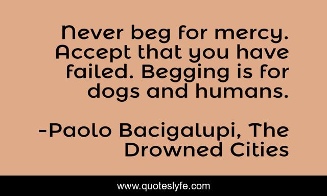 This page presents the quote "Never beg for mercy. Accept that you have failed. Begging is for dogs and humans.". Author of this quote is Paolo Bacigalupi, The Drowned Cities. This quote is about mercy, begging, acceptance-of-failure,.