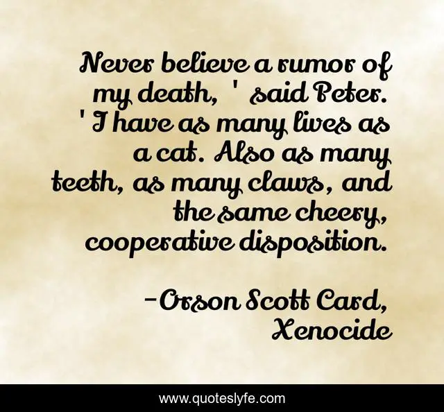 This page presents the quote "Never believe a rumor of my death, ' said Peter. 'I have as many lives as a cat. Also as many teeth, as many claws, and the same cheery, cooperative disposition.". Author of this quote is Orson Scott Card, Xenocide. This quote is about cats, peter-wiggin, ender-quintet,.