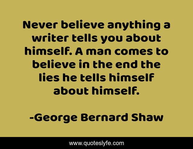 This page presents the quote "Never believe anything a writer tells you about himself. A man comes to believe in the end the lies he tells himself about himself.". Author of this quote is George Bernard Shaw. This quote is about writers, writing,.