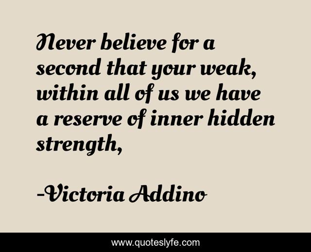 This page presents the quote "Never believe for a second that your weak, within all of us we have a reserve of inner hidden strength, ". Author of this quote is Victoria Addino. This quote is about strength, mental-balance, conquer, struggle, challenge-inspiration-motivation, structure,.