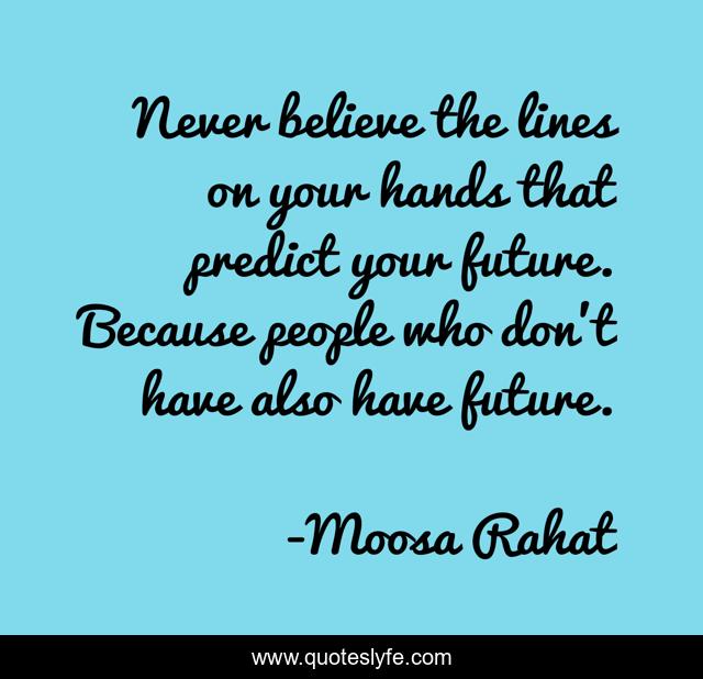 This page presents the quote "Never believe the lines on your hands that predict your future. Because people who don't have also have future.". Author of this quote is Moosa Rahat. This quote is about predict, believe, future, lines, hands,.