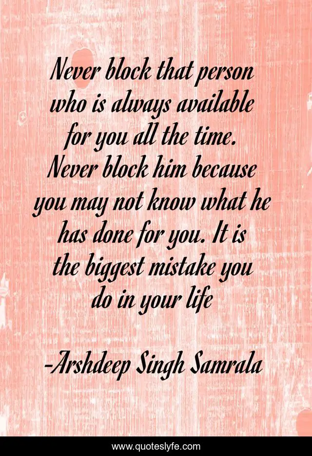 This page presents the quote "Never block that person who is always available for you all the time. Never block him because you may not know what he has done for you. It is the biggest mistake you do in your life". Author of this quote is Arshdeep Singh Samrala. This quote is about true-love, never-block-the-true-person, arsh-samrala, true-love-in-time,.