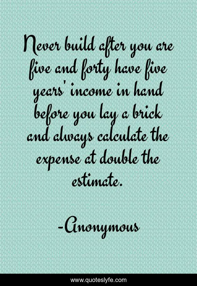 This page presents the quote "Never build after you are five and forty have five years' income in hand before you lay a brick and always calculate the expense at double the estimate.". Author of this quote is Anonymous. .