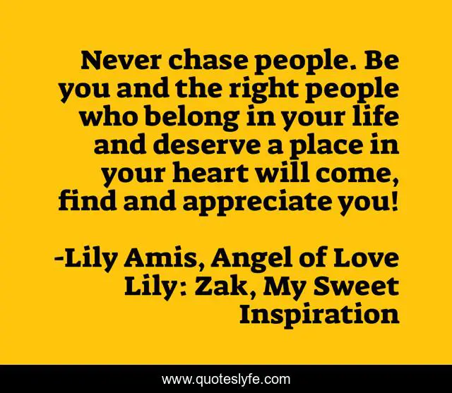 This page presents the quote "Never chase people. Be you and the right people who belong in your life and deserve a place in your heart will come, find and appreciate you!". Author of this quote is Lily Amis, Angel of Love Lily: Zak, My Sweet Inspiration. This quote is about heart, chase, love, affection, deserve,.