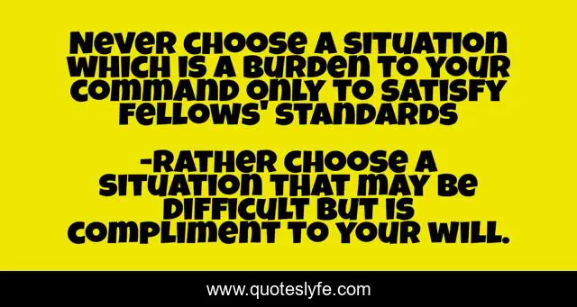 This page presents the quote "Never choose a situation which is a burden to your command only to satisfy fellows' standards". Author of this quote is rather choose a situation that may be difficult but is compliment to your will.. .