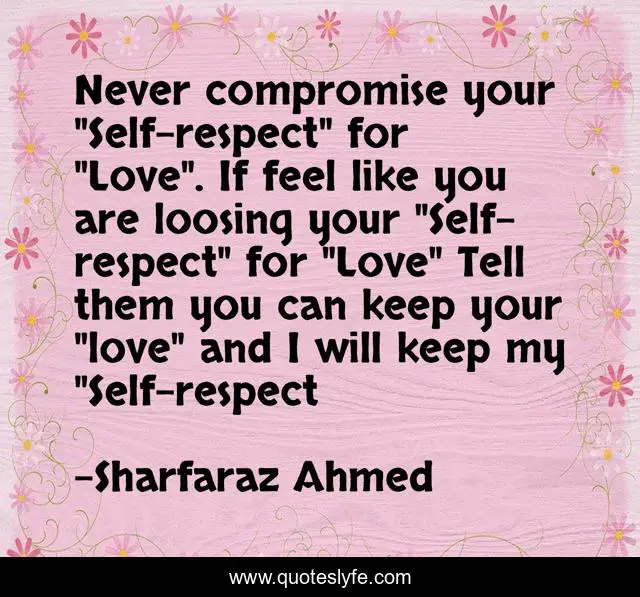 This page presents the quote "Never compromise your "Self-respect" for "Love". If feel like you are loosing your "Self-respect" for "Love" Tell them you can keep your "love" and I will keep my "Self-respect". Author of this quote is Sharfaraz Ahmed. This quote is about life, love, love-and-sayings, life-philosophy, needy, love-hurts, life-lessons, people-relations, life-experience,.