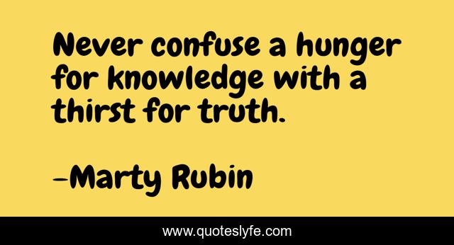 This page presents the quote "Never confuse a hunger for knowledge with a thirst for truth.". Author of this quote is Marty Rubin. This quote is about knowledge, truth,.