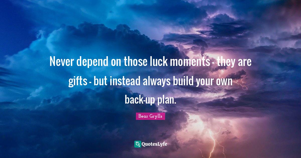 This page presents the quote "Never depend on those luck moments – they are gifts – but instead always build your own back-up plan.". Author of this quote is Bear Grylls. This quote is about moments, plans, luck,.