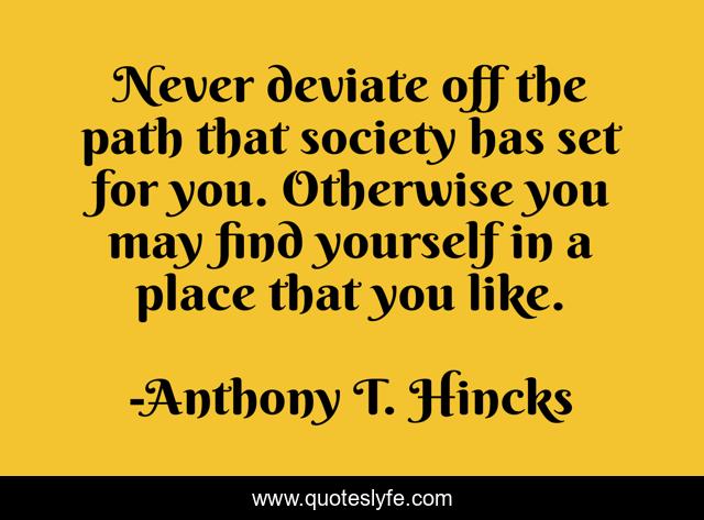 This page presents the quote "Never deviate off the path that society has set for you. Otherwise you may find yourself in a place that you like.". Author of this quote is Anthony T. Hincks. This quote is about life, places, philosophy, find, yourself, society, individual, diferent, path,.