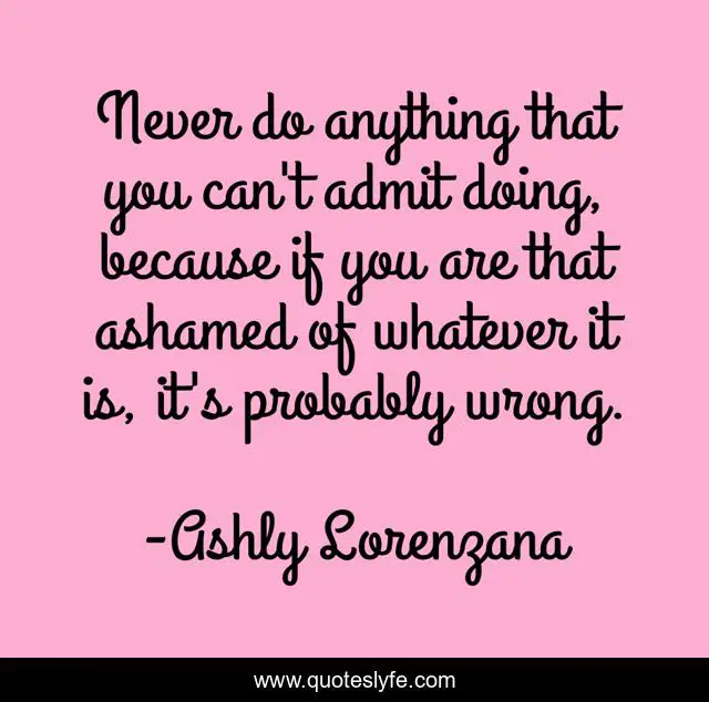 This page presents the quote "Never do anything that you can't admit doing, because if you are that ashamed of whatever it is, it's probably wrong.". Author of this quote is Ashly Lorenzana. This quote is about confession, integrity, honesty, truth, morality,.