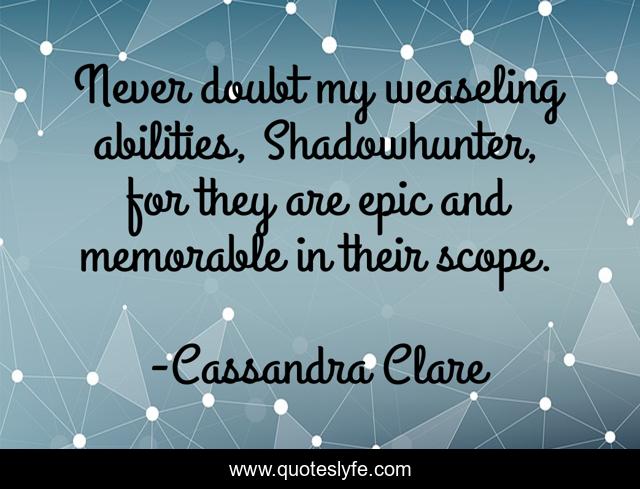 This page presents the quote "Never doubt my weaseling abilities, Shadowhunter, for they are epic and memorable in their scope.". Author of this quote is Cassandra Clare. .