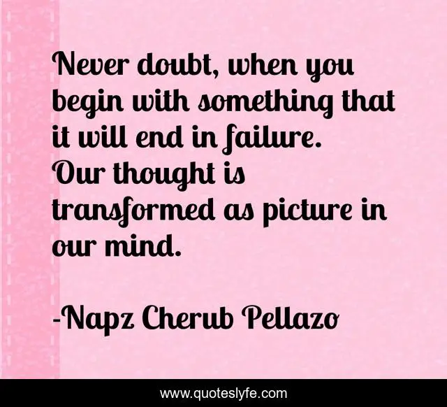 This page presents the quote "Never doubt, when you begin with something that it will end in failure. Our thought is transformed as picture in our mind.". Author of this quote is Napz Cherub Pellazo. This quote is about when-you-begin, is-transformed, in-failure, life-qoutes, that-it-will-end, with-something, inspirational, our-thought, enthusiasm,.