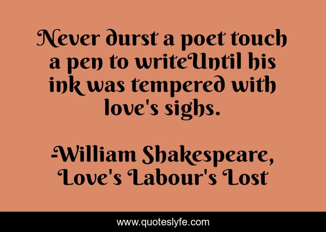 This page presents the quote "Never durst a poet touch a pen to writeUntil his ink was tempered with love's sighs.". Author of this quote is William Shakespeare, Love's Labour's Lost. This quote is about poem, love, poetry, muse, writing, affection, inspiration,.
