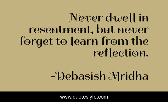 This page presents the quote "Never dwell in resentment, but never forget to learn from the reflection.". Author of this quote is Debasish Mridha. This quote is about philosophy, debasish-mridha, resentment, quotes, debasish-mridha-md, inspirational, enthusiasm, forgiveness, how-to-deal-with-resentment,.