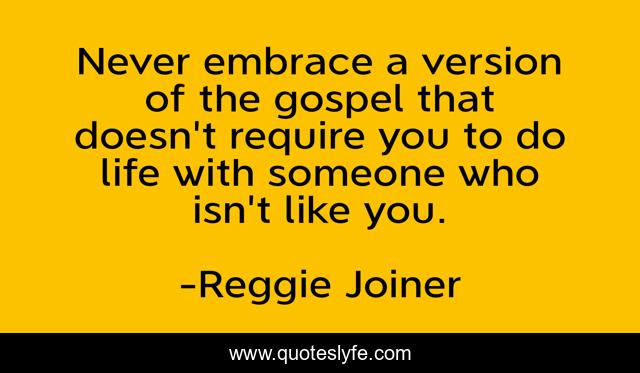 This page presents the quote "Never embrace a version of the gospel that doesn't require you to do life with someone who isn't like you.". Author of this quote is Reggie Joiner. This quote is about diversity, jesus, leadership, embrace, orange, love, gospel, affection,.