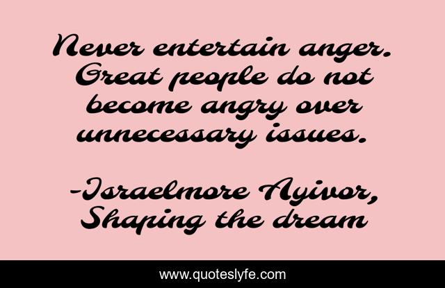 This page presents the quote "Never entertain anger. Great people do not become angry over unnecessary issues.". Author of this quote is Israelmore Ayivor, Shaping the dream. This quote is about great, entertain, people, angry, entertainment, unnecessary, food-for-thought, great-people, anger,.