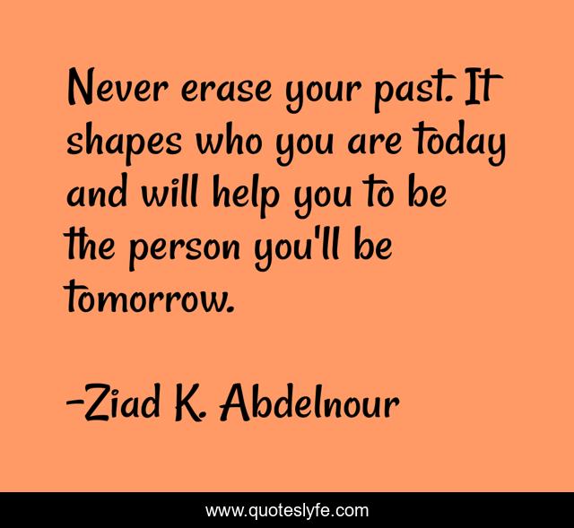 This page presents the quote "Never erase your past. It shapes who you are today and will help you to be the person you'll be tomorrow.". Author of this quote is Ziad K. Abdelnour. This quote is about past, shape,.
