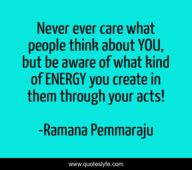 This page presents the quote "Never ever care what people think about YOU, but be aware of what kind of ENERGY you create in them through your acts!". Author of this quote is Ramana Pemmaraju. This quote is about thinking, energy,.