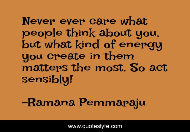 This page presents the quote "Never ever care what people think about you, but what kind of energy you create in them matters the most. So act sensibly!". Author of this quote is Ramana Pemmaraju. This quote is about thinking, energy,.