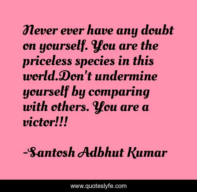 This page presents the quote "Never ever have any doubt on yourself. You are the priceless species in this world.Don't undermine yourself by comparing with others. You are a victor!!!". Author of this quote is Santosh Adbhut Kumar. This quote is about adbhut, yourself, doubt, priceless, species, undermine, victor,.