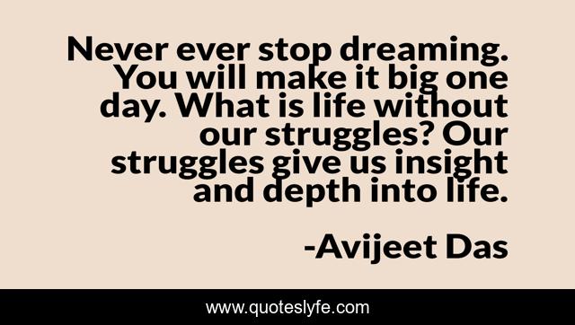 This page presents the quote "Never ever stop dreaming. You will make it big one day. What is life without our struggles? Our struggles give us insight and depth into life.". Author of this quote is Avijeet Das. This quote is about struggles, life-and-sayings, life-inspirational, depth, dreaming, meaning-of-life, dreams, insightful,.