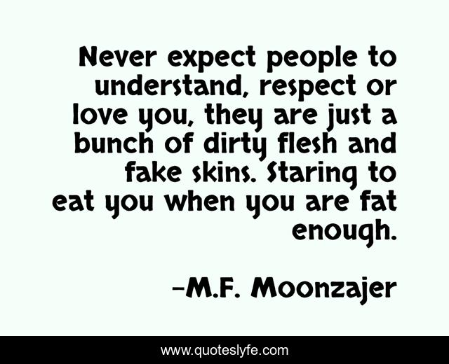 This page presents the quote "Never expect people to understand, respect or love you, they are just a bunch of dirty flesh and fake skins. Staring to eat you when you are fat enough.". Author of this quote is M.F. Moonzajer. This quote is about fake-skins, dirty-flesh, understand, expect, respect, love, affection, staring,.