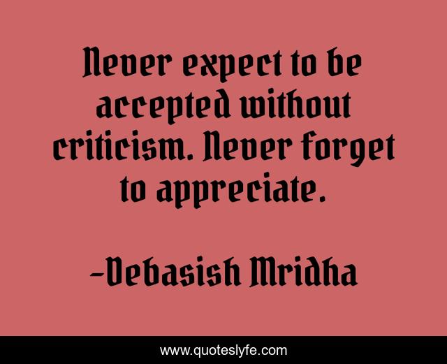 This page presents the quote "Never expect to be accepted without criticism. Never forget to appreciate.". Author of this quote is Debasish Mridha. This quote is about criticism, miraboli, oscar-wilde, philosophy, debasish-mridha, gandhi, quotes, never-expect-to-be-accepted, inspirational,.