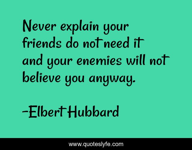 This page presents the quote "Never explain―your friends do not need it and your enemies will not believe you anyway.". Author of this quote is Elbert Hubbard. This quote is about explanations, friends, enemies,.
