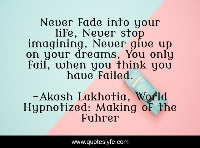This page presents the quote "Never fade into your life, Never stop imagining, Never give up on your dreams, You only fail, when you think you have failed.". Author of this quote is Akash Lakhotia, World Hypnotized: Making of the Fuhrer. This quote is about non-fiction, life, literature, philosophy, motivational-inspirational, motivational, motivation, thoughts-of-the-mind, philosophical,.