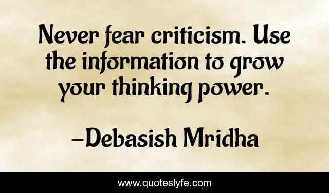 This page presents the quote "Never fear criticism. Use the information to grow your thinking power.". Author of this quote is Debasish Mridha. This quote is about criticism, thinking-power, philosophy, debasish-mridha, grow-your-thinking-power, quotes, never-fear-criticism, debasish-mridha-md, inspirational,.