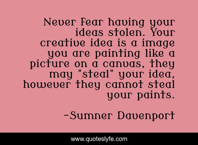 This page presents the quote "Never fear having your ideas stolen. Your creative idea is a image you are painting like a picture on a canvas, they may "steal" your idea, however they cannot steal your paints.". Author of this quote is Sumner Davenport. This quote is about behaviour, attitude, creativity, bouncing-back,.