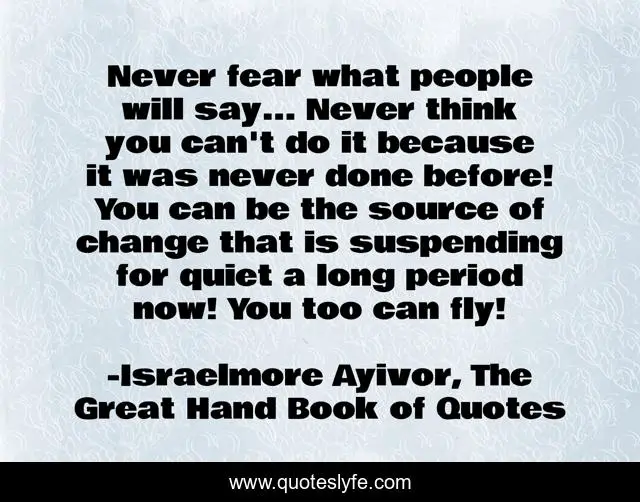 This page presents the quote "Never fear what people will say... Never think you can't do it because it was never done before! You can be the source of change that is suspending for quiet a long period now! You too can fly!". Author of this quote is Israelmore Ayivor, The Great Hand Book of Quotes. This quote is about fly, change-the-world, suspend, people, period, innovate, source, never-be-afraid, invent,.