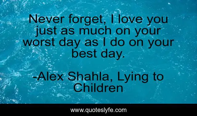 This page presents the quote "Never forget, I love you just as much on your worst day as I do on your best day.". Author of this quote is Alex Shahla, Lying to Children. This quote is about parent, love, unconditional-love, affection, child,.