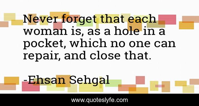 This page presents the quote "Never forget that each woman is, as a hole in a pocket, which no one can repair, and close that.". Author of this quote is Ehsan Sehgal. .