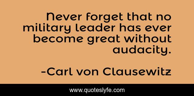 This page presents the quote "Never forget that no military leader has ever become great without audacity.". Author of this quote is Carl von Clausewitz. This quote is about military, leader,.