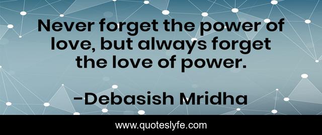 This page presents the quote "Never forget the power of love, but always forget the love of power.". Author of this quote is Debasish Mridha. This quote is about love, philosophy, debasish-mridha, power-of-love, love-of-power, quotes, inspirational, enthusiasm, debasish-mridha-m-d,.