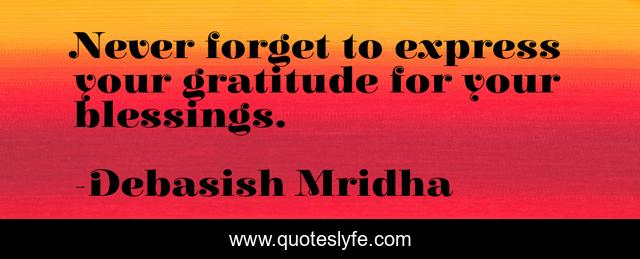 This page presents the quote "Never forget to express your gratitude for your blessings.". Author of this quote is Debasish Mridha. This quote is about gratitude, philosophy, debasish-mridha, quotes, blessings, inspirational, enthusiasm, debasish-mridha-m-d,.