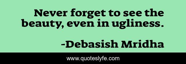 This page presents the quote "Never forget to see the beauty, even in ugliness.". Author of this quote is Debasish Mridha. This quote is about life, love, knowledge, inspirational, intelligence, philosophy, wisdom, quotes, affection,.
