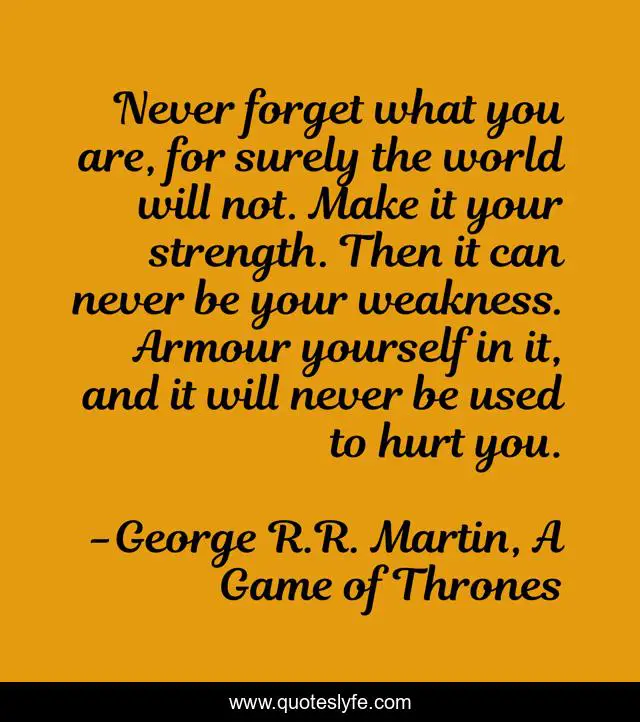 This page presents the quote "Never forget what you are, for surely the world will not. Make it your strength. Then it can never be your weakness. Armour yourself in it, and it will never be used to hurt you.". Author of this quote is George R.R. Martin, A Game of Thrones. .