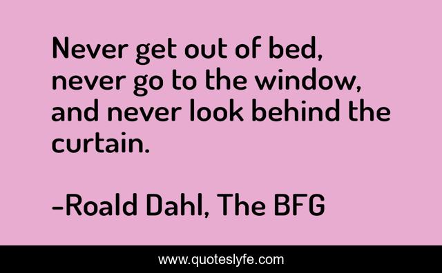 This page presents the quote "Never get out of bed, never go to the window, and never look behind the curtain.". Author of this quote is Roald Dahl, The BFG. This quote is about giants, orphans, magic, sophie,.