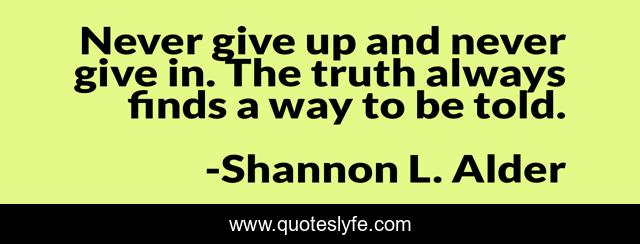 This page presents the quote "Never give up and never give in. The truth always finds a way to be told.". Author of this quote is Shannon L. Alder. This quote is about faith, empathy, honesty, compassion, justice, truth, kindness, integrity, never-give-in,.
