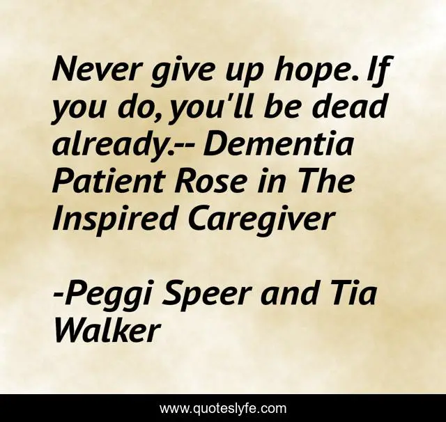 This page presents the quote "Never give up hope. If you do, you'll be dead already.-- Dementia Patient Rose in The Inspired Caregiver". Author of this quote is Peggi Speer and Tia Walker. This quote is about motivation, caretaker, alzheimer-s, dementia, aging, caregiver, quotes-on-inspiration, aging-parent, inspiring-on-life,.