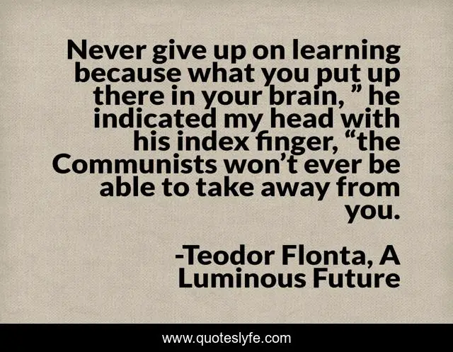 This page presents the quote "Never give up on learning because what you put up there in your brain, ” he indicated my head with his index finger, “the Communists won’t ever be able to take away from you.". Author of this quote is Teodor Flonta, A Luminous Future. This quote is about life, communism, love, secret-police, transylvania, witches, affection, vampires,.