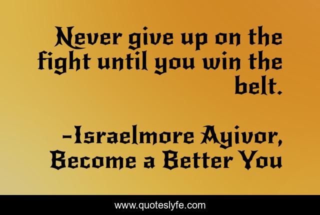This page presents the quote "Never give up on the fight until you win the belt.". Author of this quote is Israelmore Ayivor, Become a Better You. This quote is about box, trophy, food-for-thought, fight-for-it, better-you, win-your-fight, success, fight, battle,.