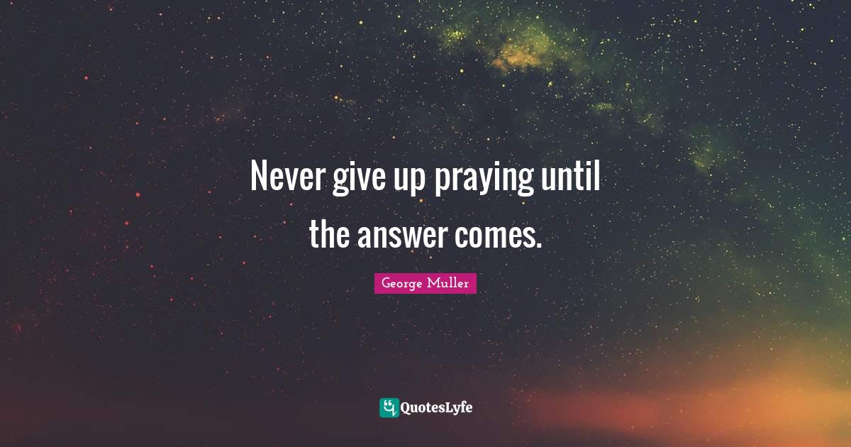 This page presents the quote "Never give up praying until the answer comes.". Author of this quote is George Muller. This quote is about giving up, answers, praying,.
