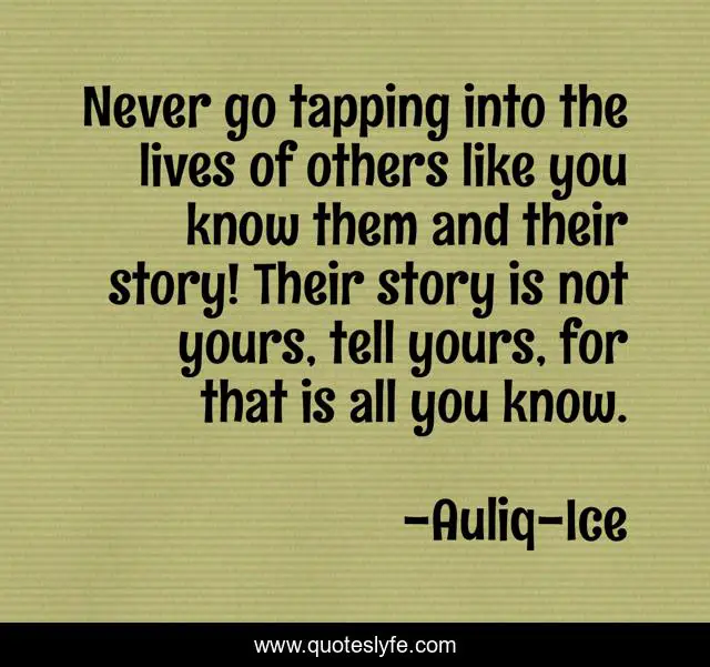 This page presents the quote "Never go tapping into the lives of others like you know them and their story! Their story is not yours, tell yours, for that is all you know.". Author of this quote is Auliq-Ice. This quote is about life, optimism, positive-attitude, life-story, goal-setting, self-judgement, life-struggles, judging-others, purpose-of-life,.